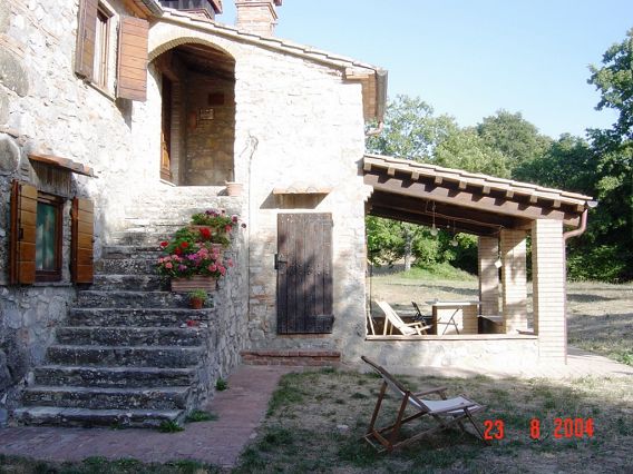 San Casciano dei Bagni: Lungo la strada panoramica del Monte di Cetona, dopo un brevissimo tratto di bosco, si accede ad una suggestiva e sorprendente radura dove è situata un´antica colonica in pietra, su due piani. La proprietà è composta da 4 ettari di terreno, con un piccolo frutteto, querce secolari e cipressi. La casa di 240 mq, ha a piano terra un ingresso, un soggiorno con grande camino, pranzo e cucina. Al piano superiore, 3 camere e due bagni.All´esterno un portico attrezzato con BBQ.